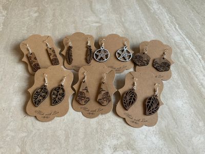 Unusual wood cut earrings, Coasters, and Signs of all shapes and sizes1